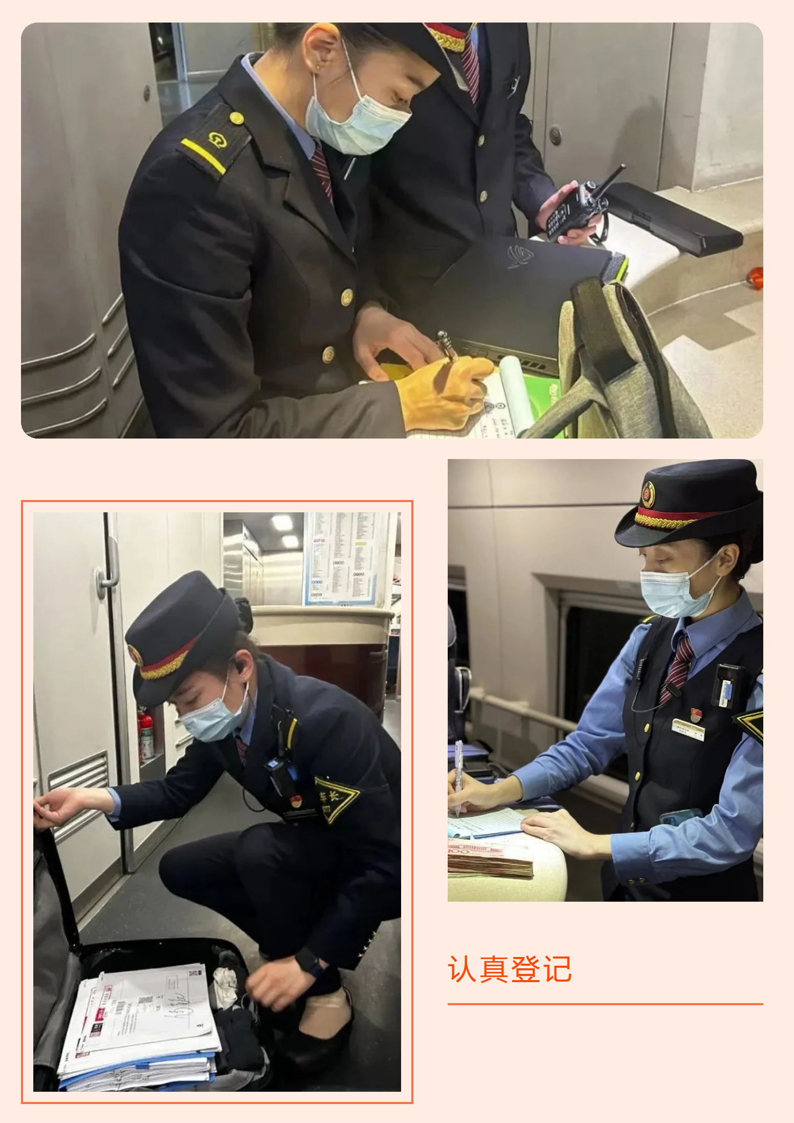 在值乘的旅途中,總是能拾到各式各樣的旅客遺失物品。每當(dāng)發(fā)現(xiàn)遺失物品時,乘務(wù)員們會第一時間在K3執(zhí)法記錄儀的監(jiān)控下打開包裹,尋找失主的聯(lián)系方式,以最快的時間歸還遺失物,沒有找到聯(lián)系方式的按照規(guī)定做好登記,及時交予車站處置。同時根據(jù)遺失物品總結(jié)出易發(fā)生物品遺失的區(qū)段和人員,有針對性的進(jìn)行廣播宣傳,有效降低乘客遺失物品的幾率,降低乘客的財產(chǎn)損失,體現(xiàn)“人民鐵路為人民”的服務(wù)宗旨。